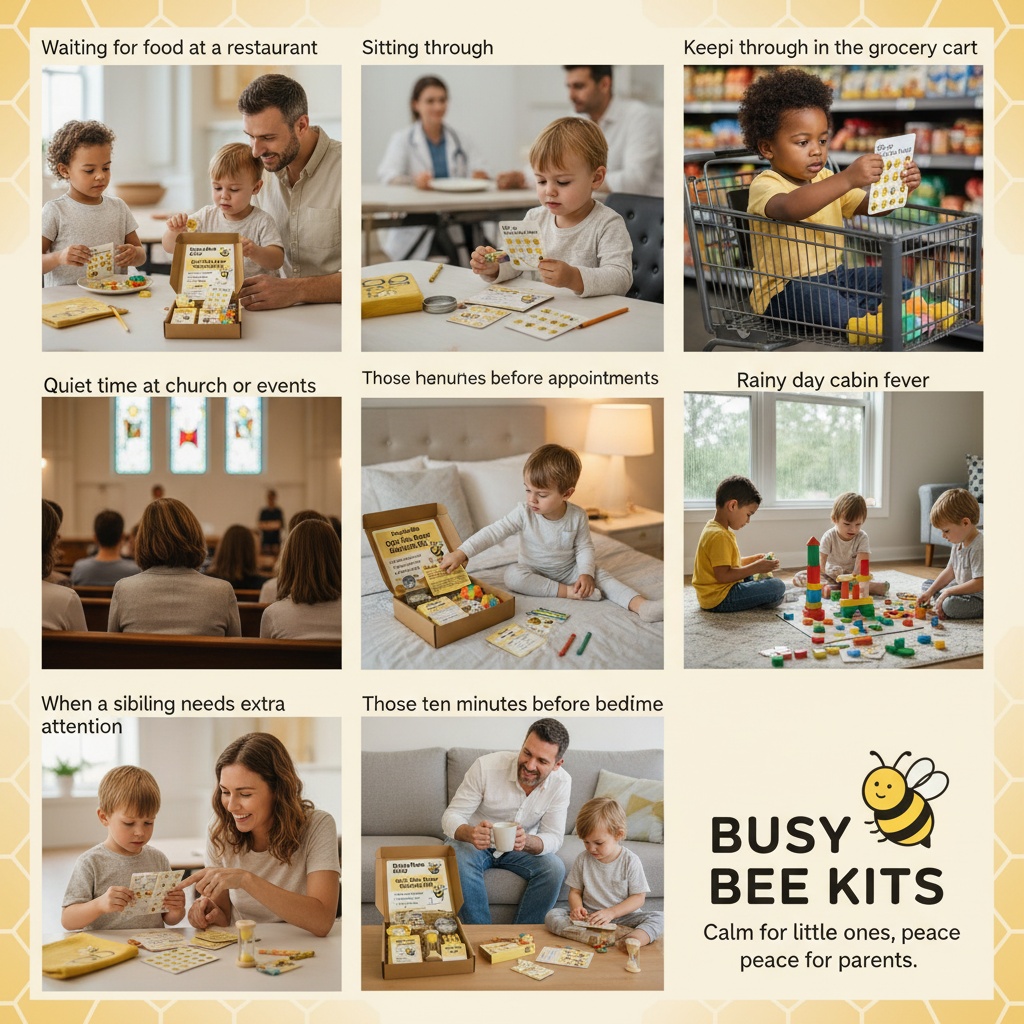Kids get restless in waiting rooms, restaurants, car lines, church rows, grocery aisles, and right when you need to handle something important. BusyBee Kits were made to give you a quick, screen free way to keep little hands busy and little minds focused. Every kit is filled with simple activities kids can do on their own with very little help from you.